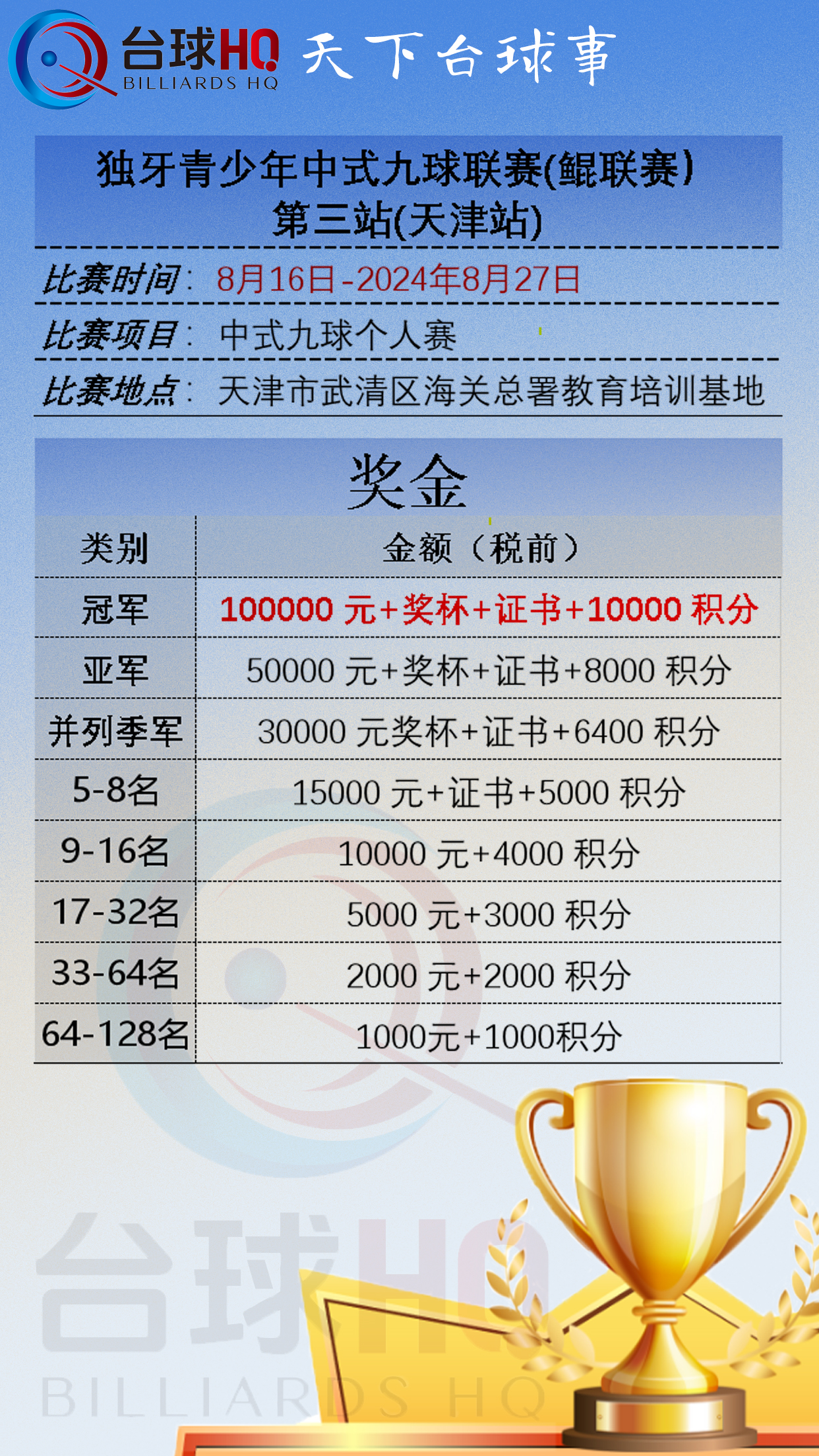 独牙|青少年中式九球联赛(鲲联赛)第三站(天津站)·奖金·地点