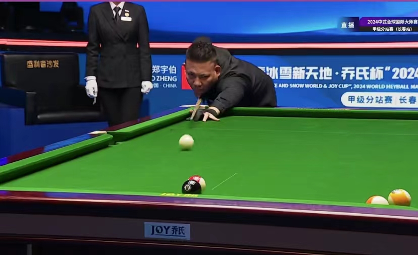 郑肖淮第二局精准勾中九号球入中袋定乾坤。