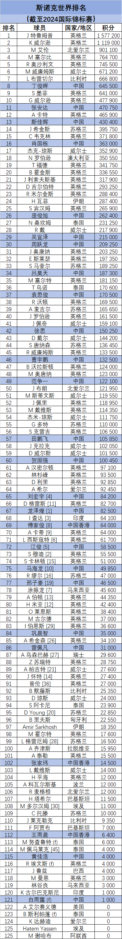 斯诺克官方世界排名(截至2024国际锦标赛)