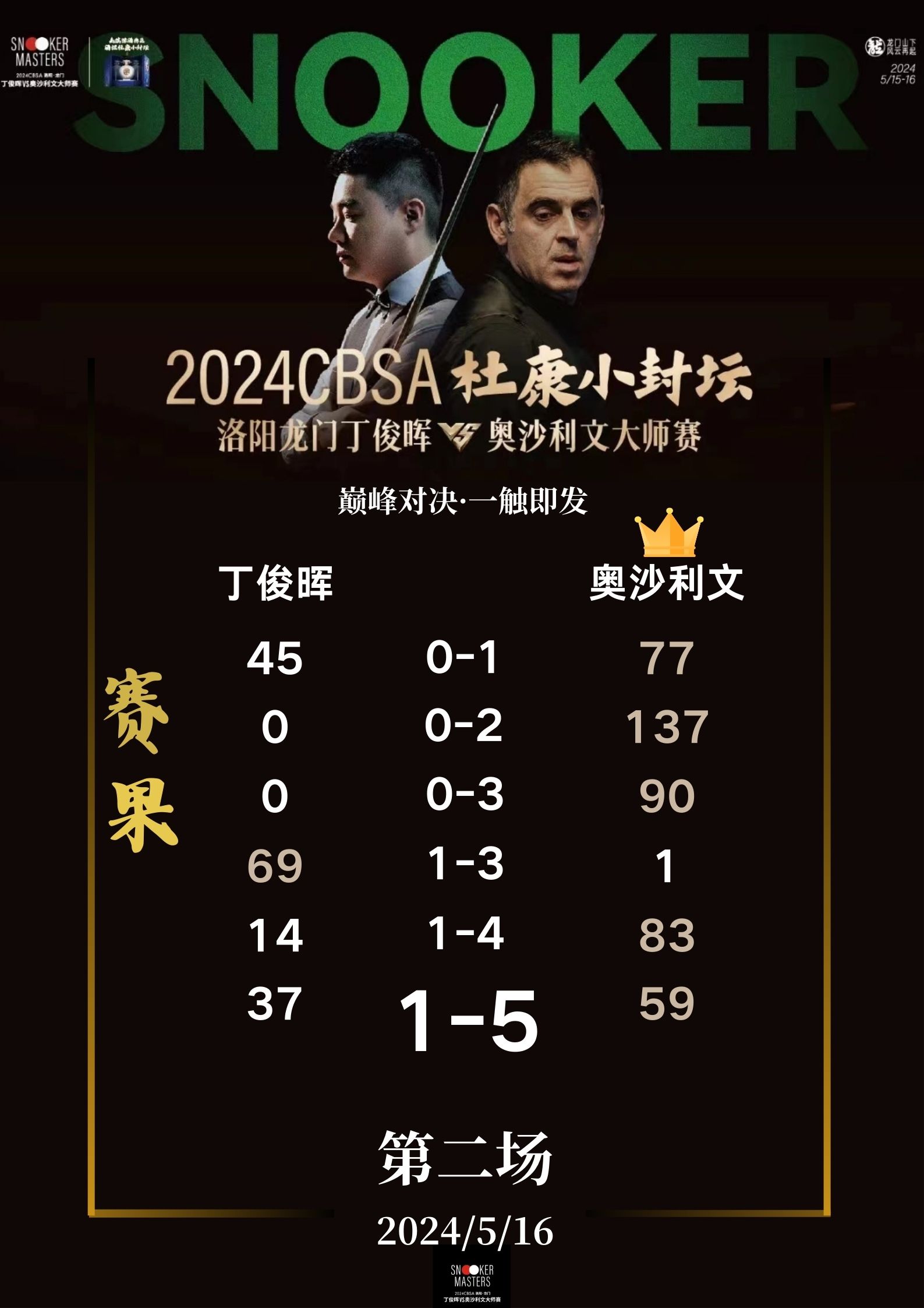 CBSA丁奥龙门大师赛16日赛果[奥沙利文胜]