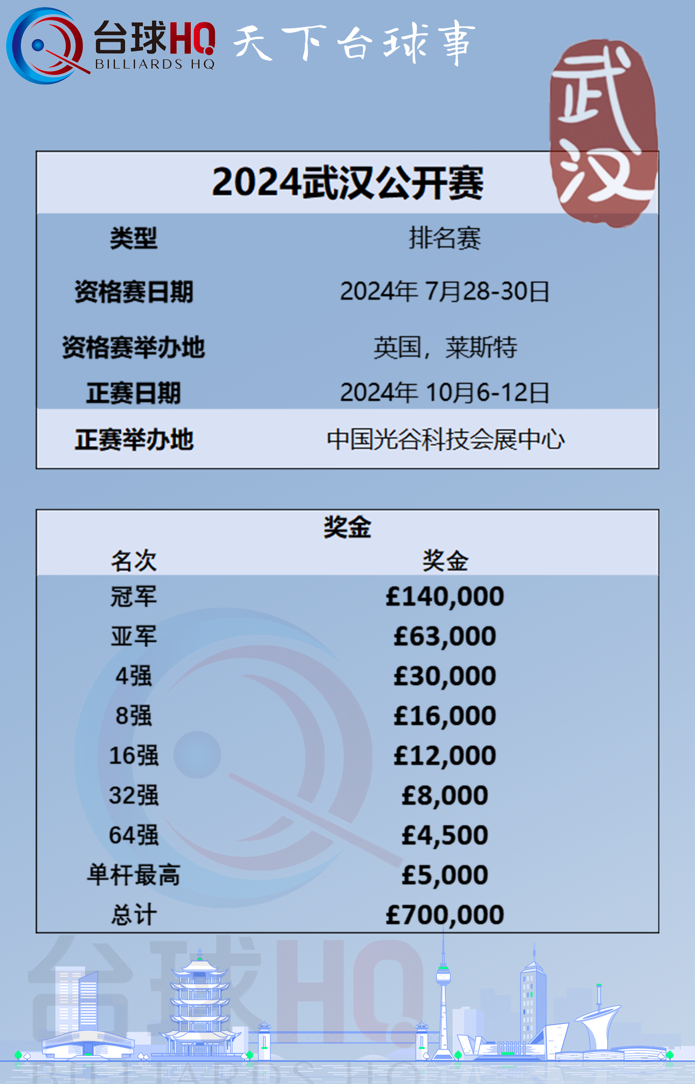 2024武汉公开赛·奖金·冠军奖金14万镑!