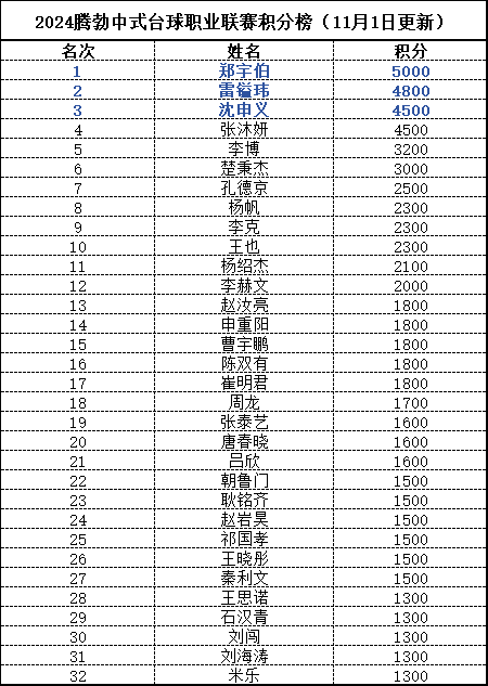2024年度积分公示 “野豹·奥斯本兹·利百文·黛纳斯菲” 腾勃中式台球职业联赛(11月1日更新)