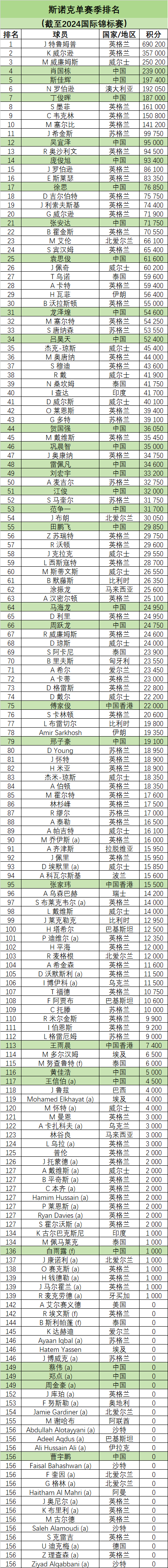 斯诺克单赛季排名(截至2024国际锦标赛)