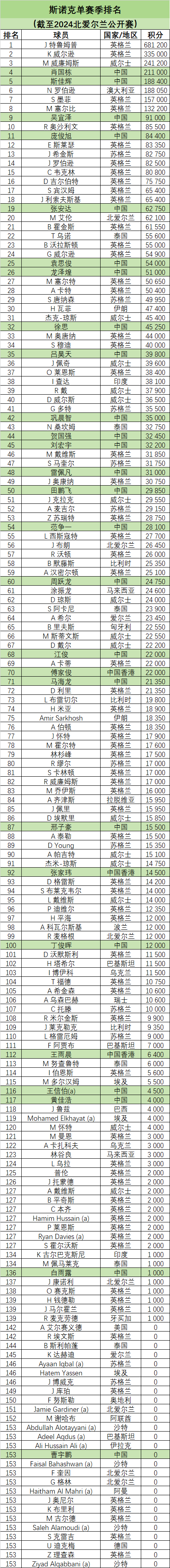 斯诺克单赛季排名(截至2024北爱尔兰公开赛)