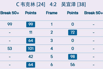 C 韦克林 [24] 4:2 吴宜泽 [38] 详情