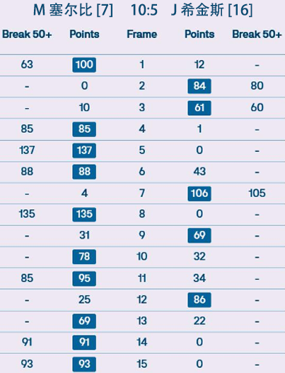 M 塞尔比 [7] 10:5 J 希金斯 [16] 详情