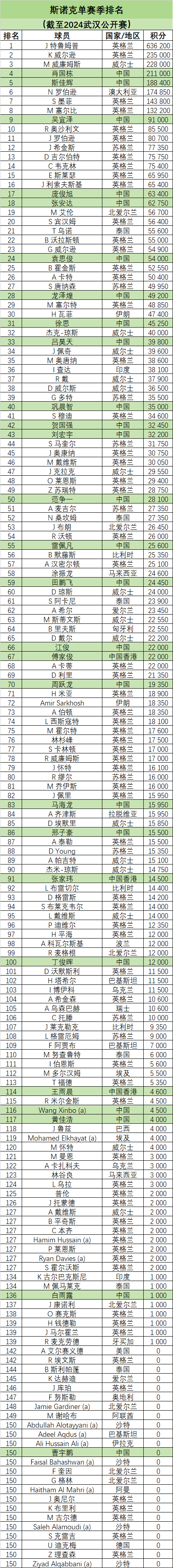 斯诺克单赛季排名(截至2024武汉公开赛)