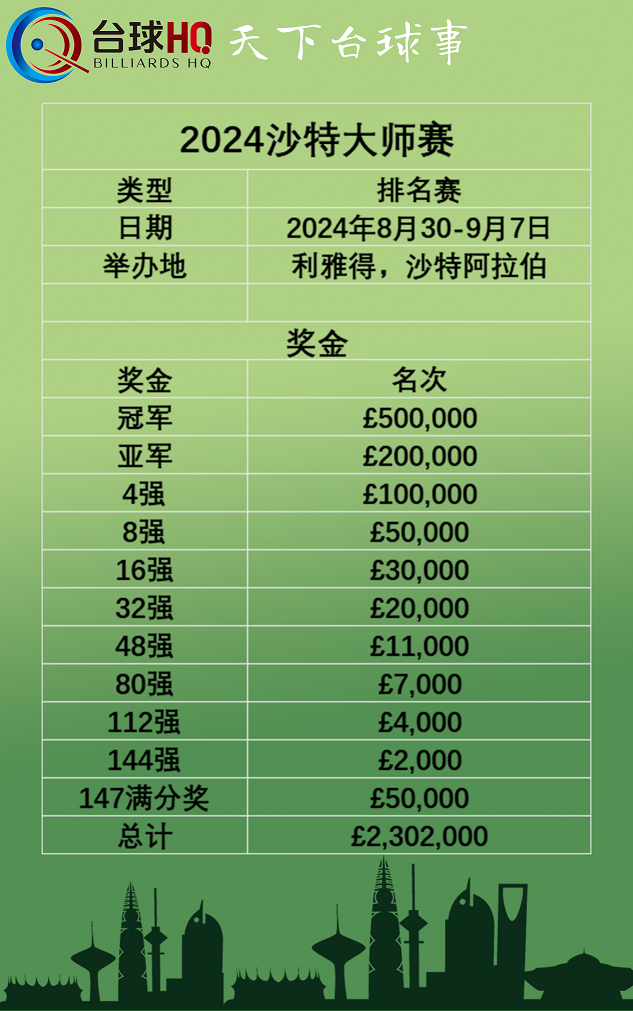2024沙特大师赛·奖金·冠军奖金50万镑!