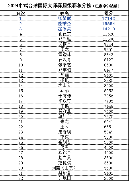乔氏|24大师赛·甲级赛积分榜(巴彦淖尔站后)