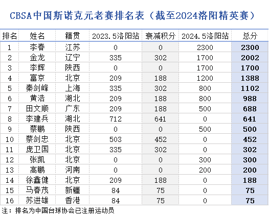 CBSA中国斯诺克元老赛排名(截至24洛阳精英赛)