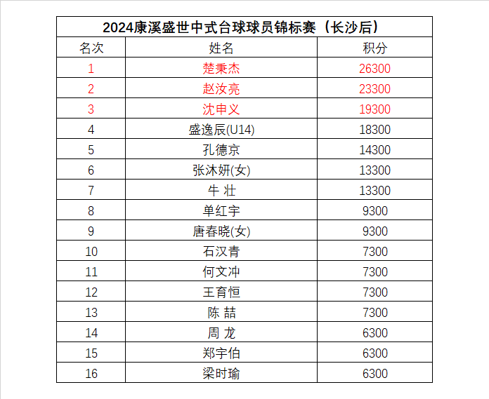 2024“康溪盛世”中式台球球员锦标赛积分排名(长沙站后)