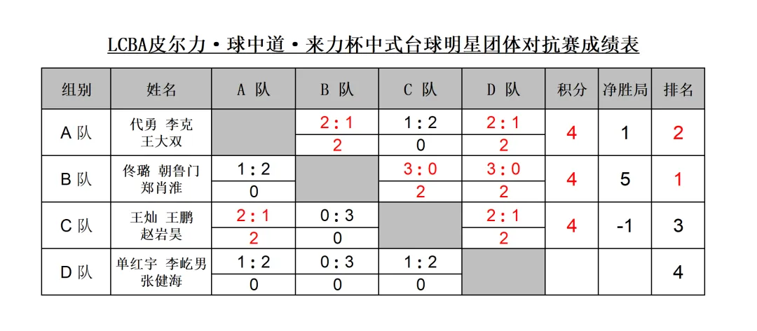 - 每场比赛参赛双方须打满三场比赛,每场比赛的胜负局数都将做为小组比赛的有效成绩。