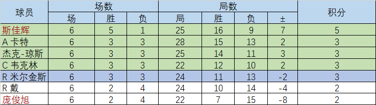 队员按得分最多、胜局最多、负局最少依次排