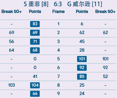 墨菲在第六局打出147,这是他第九次打出满分杆,也是职业斯诺克的第210次。