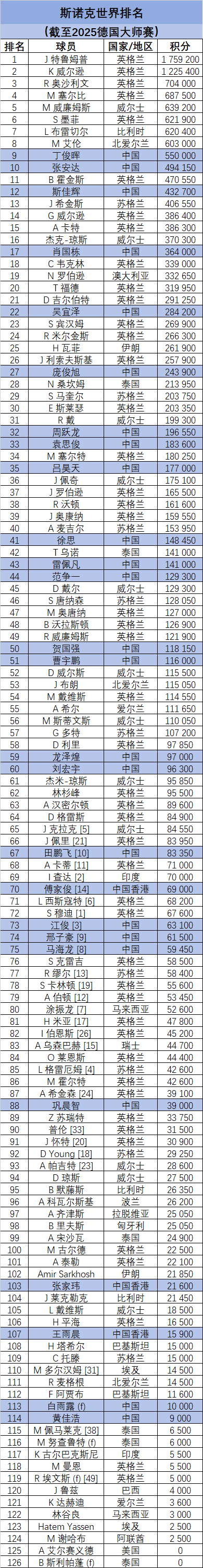 斯诺克官方世界排名(截至2025德国大师赛)