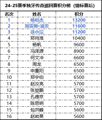 独牙|24-25赛季独牙传奇巡回赛积分榜(锦标赛后)