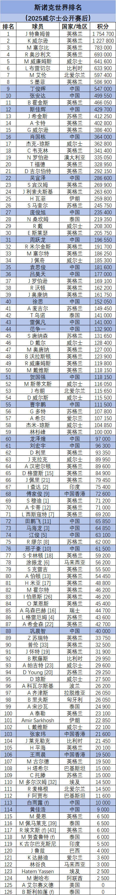 【职业斯诺克】 世界职业斯诺克排名