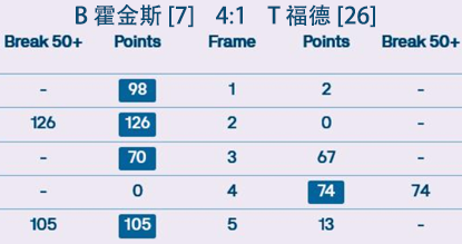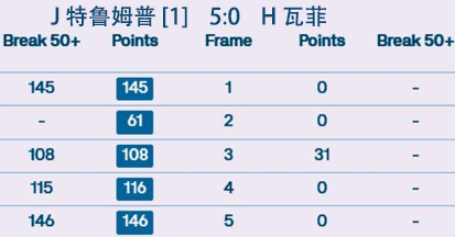 特鲁姆普最后一局打出赛事单杆最高分146 分。全场比赛打出4杆单杆破百。特鲁姆普第 100 次进入排名赛四分之一决赛。