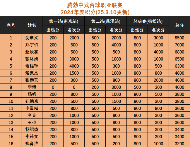 腾勃|中式台球职业联赛2024-2025年度积分排名(宿松总决赛后)