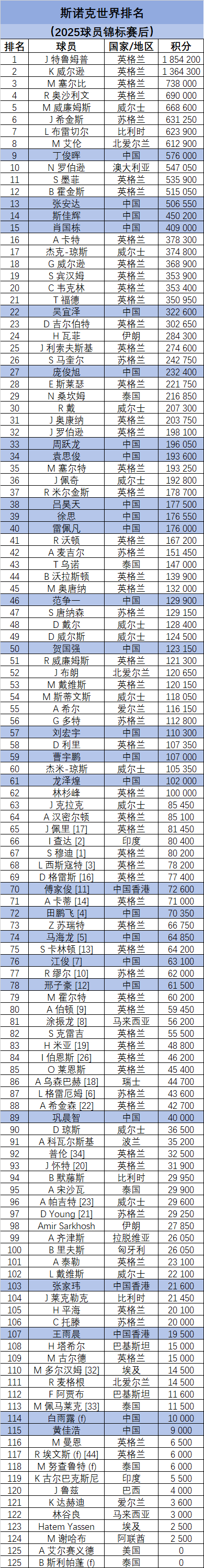 斯诺克官方世界排名(2025球员锦标赛后)