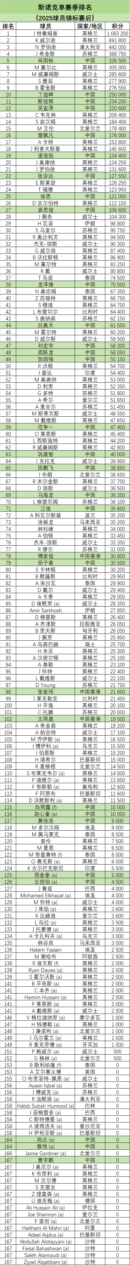 斯诺克单赛季排名(2025球员锦标赛后)