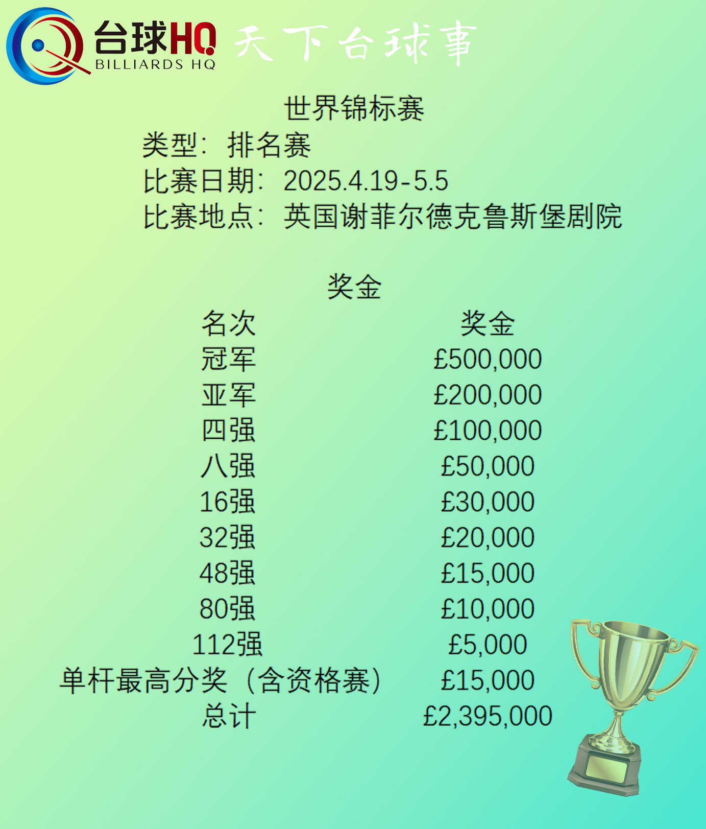 【赛程报道】2025世界锦标赛·奖金·冠军奖金50万镑!