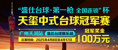 “盛仕台球·第一枪 全国连锁”杯 2025·天玺中式台球冠军赛(广州天河站)为积分赛。举办地点位于广东省广州市,时间定于2025年4月8日至4月17日,冠军奖金100万元!亚军奖金40万!季军奖金20万!