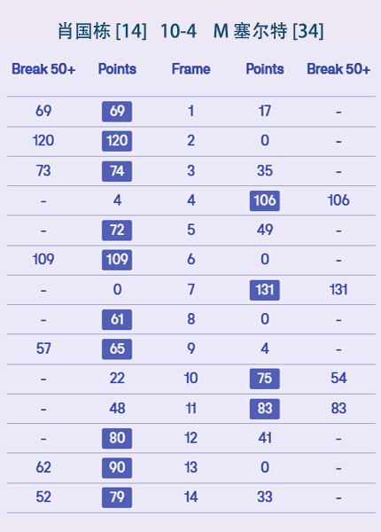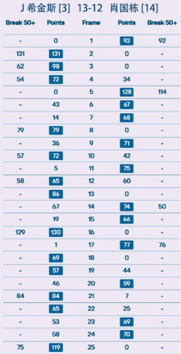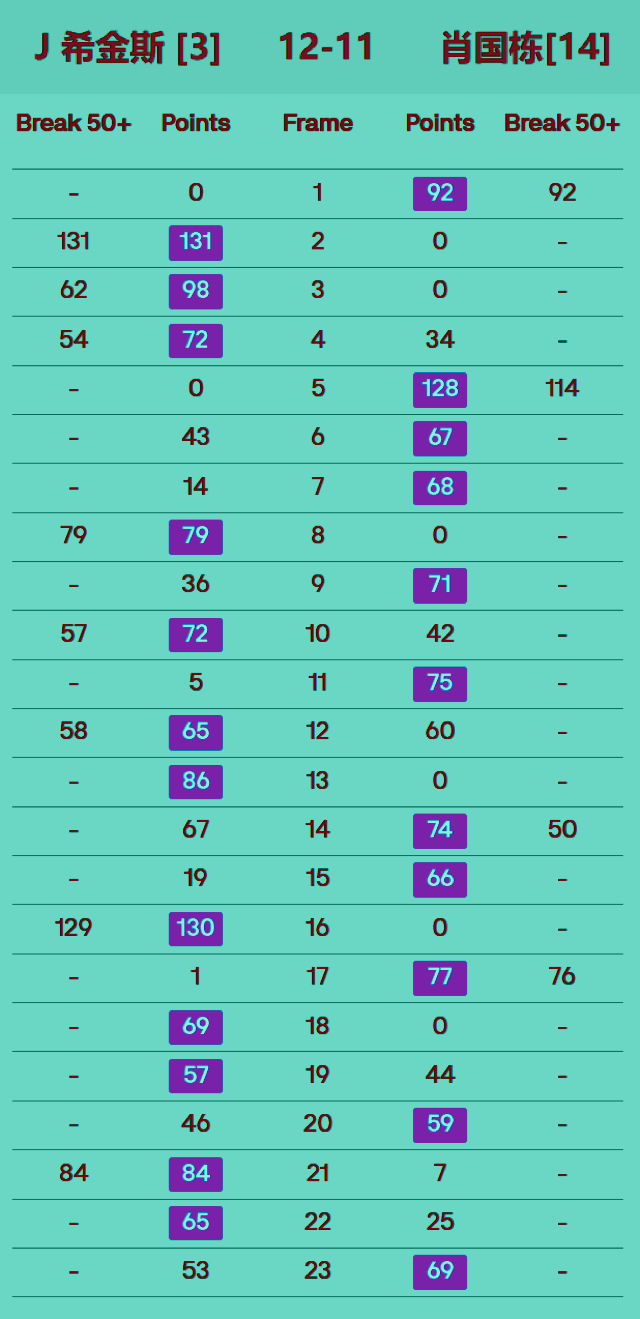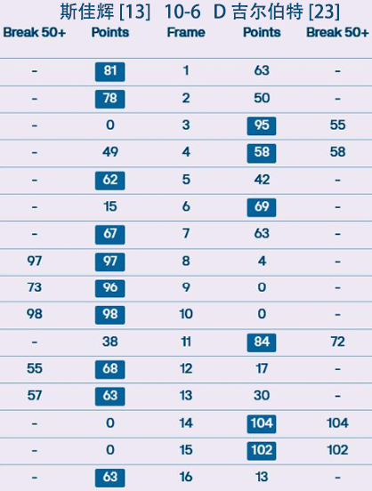 第11局吉尔伯特冲击147止步于72分。斯佳辉未能打进最后一颗红球,错失清台单局逆转的机会