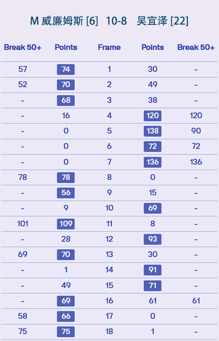 M 威廉姆斯 [6] 10-8 吴宜泽 [22] 详情