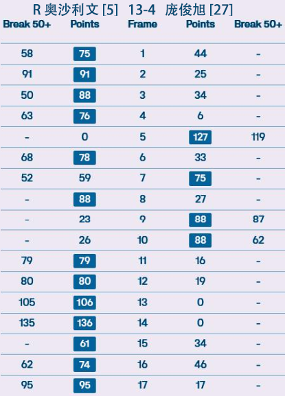 R 奥沙利文 [5] 13-4 庞俊旭 [27] 详情