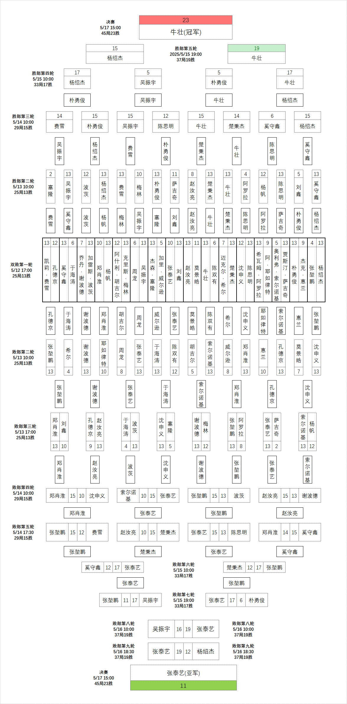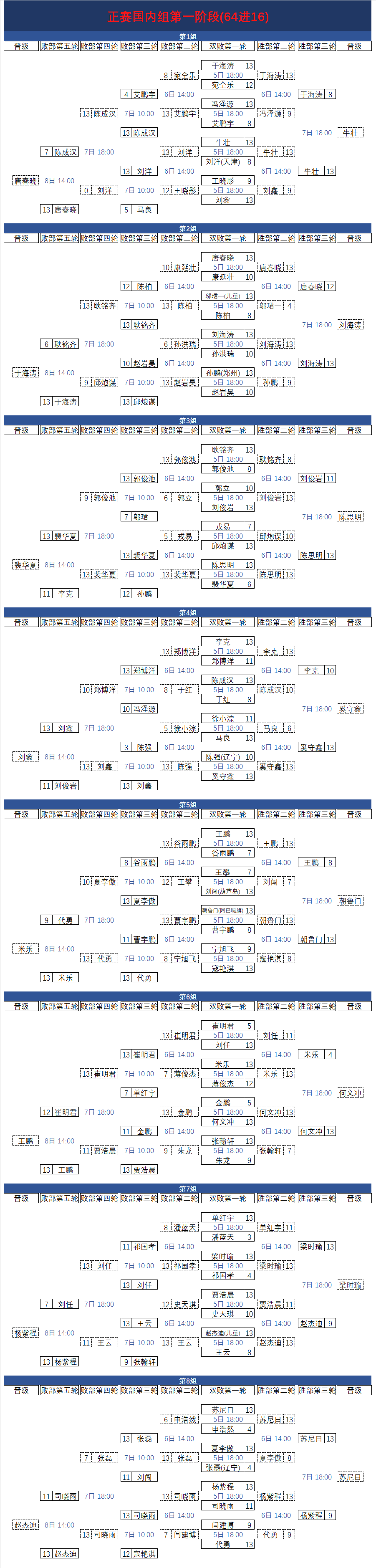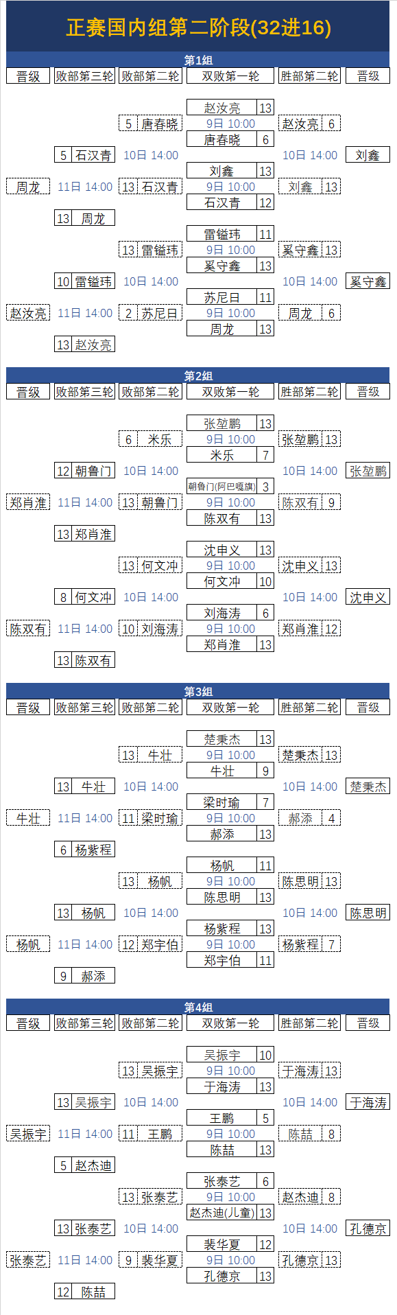 国内组败部晋级总决赛32强(国内组16强):周龙、吴振宇、牛壮、杨帆、赵汝亮、张泰艺、陈双有、郑肖淮