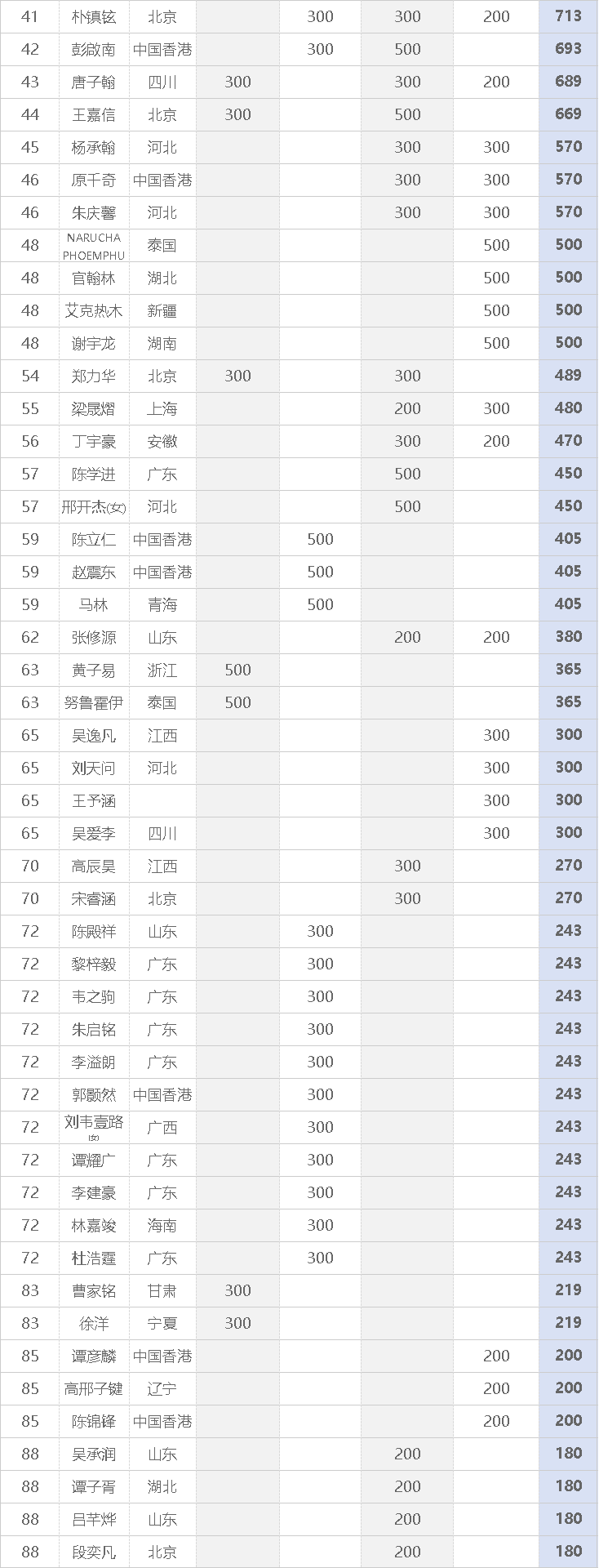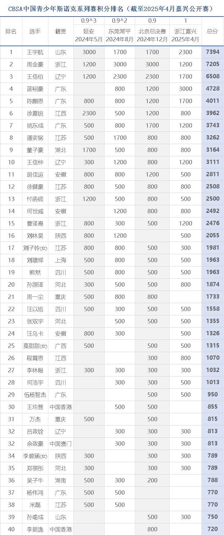 【CBSA】CBSA中国青少年斯诺克系列赛积分排名(截至2025年4月嘉兴公开赛)