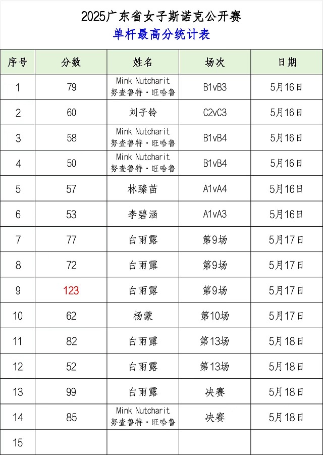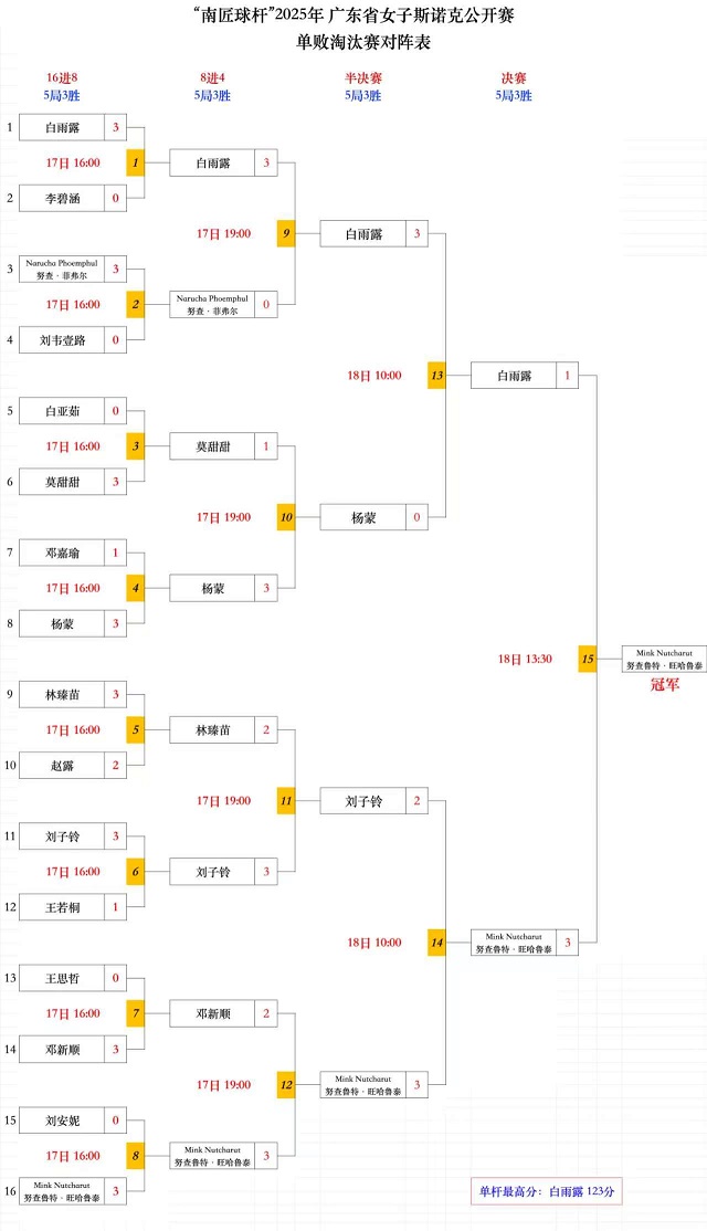 首届广东省女子斯诺克公开赛(努查鲁特冠军,白雨露亚军+单杆最高)·对阵表·单杆