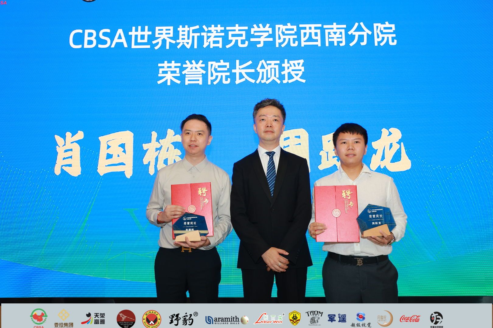 作为川渝斯诺克杰出代表,肖国栋与周跃龙欣然受聘担任学院荣誉院长,张涛院长现场为他们颁发了聘书。