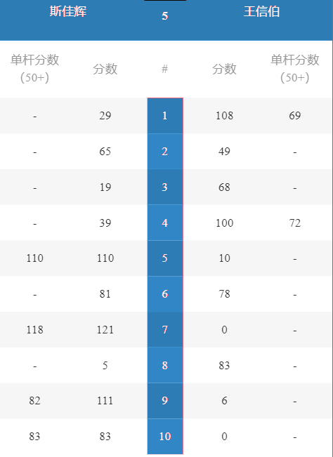 比赛暂停,比分定格在5-4(斯佳辉领先),以确保下一时段的两张球台均能按计划开赛