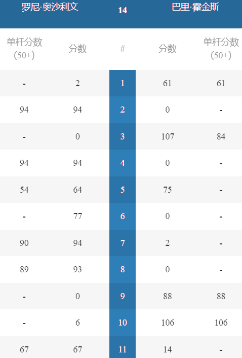 R 奥沙利文 [6] 6-5 霍金斯[10] 详情