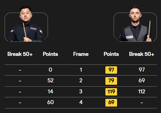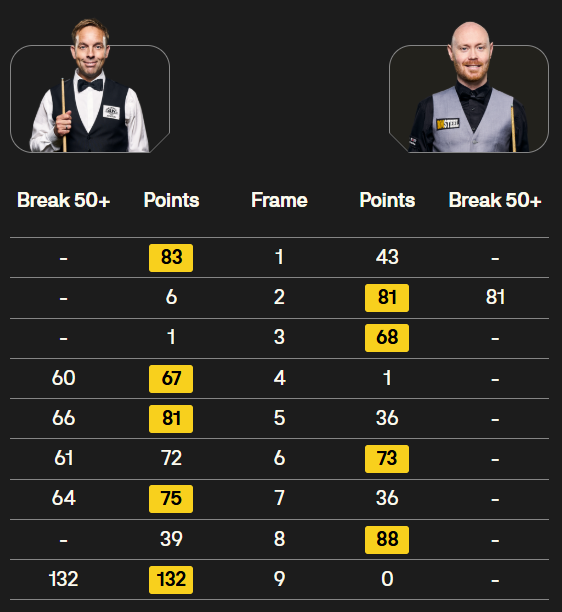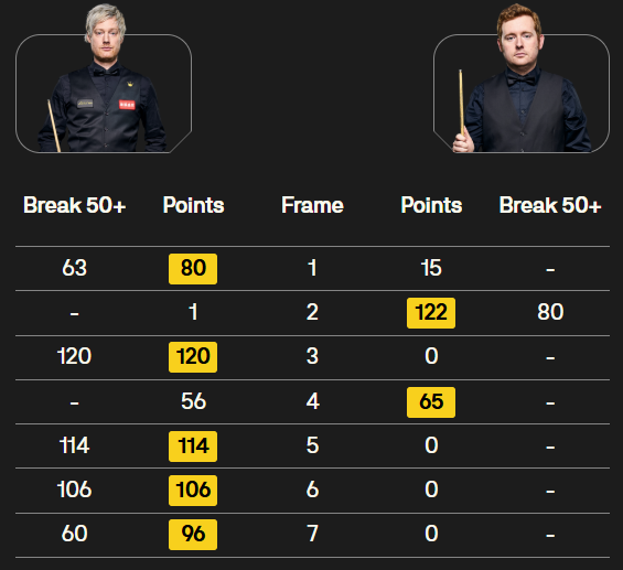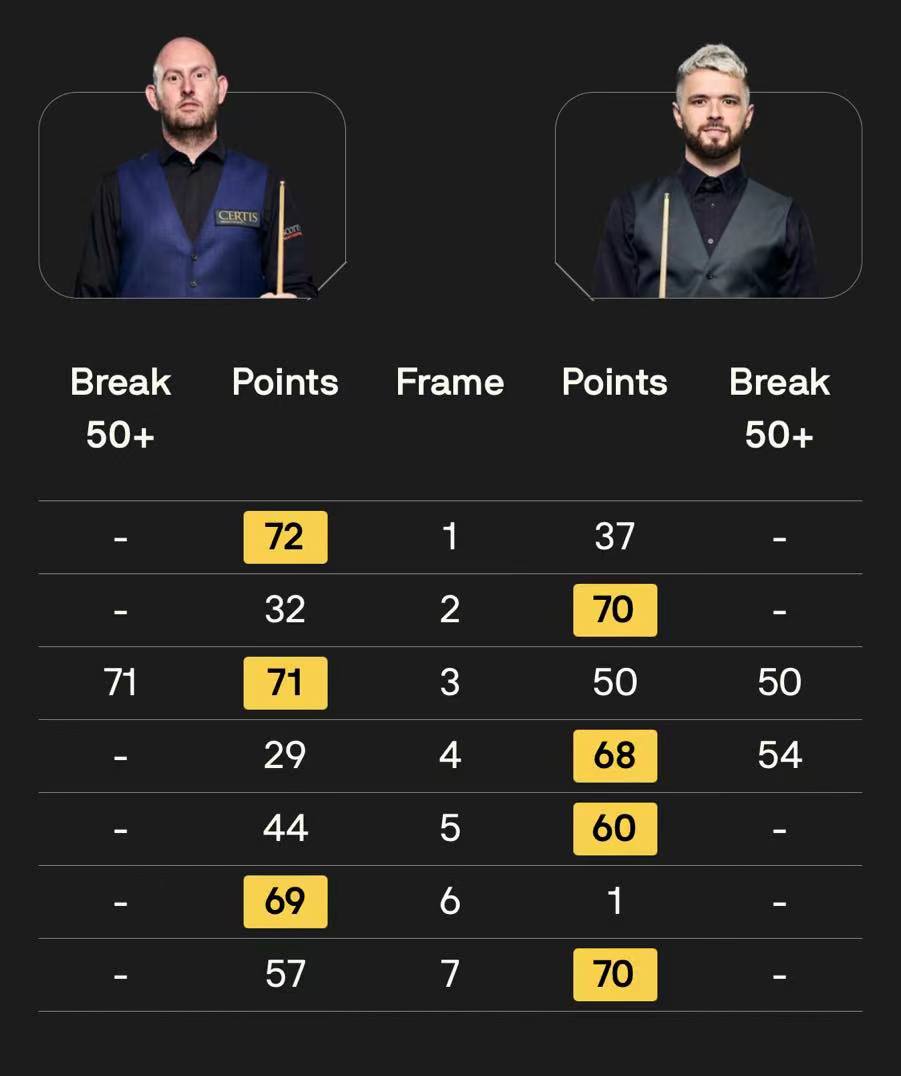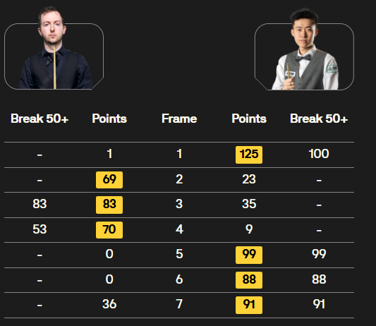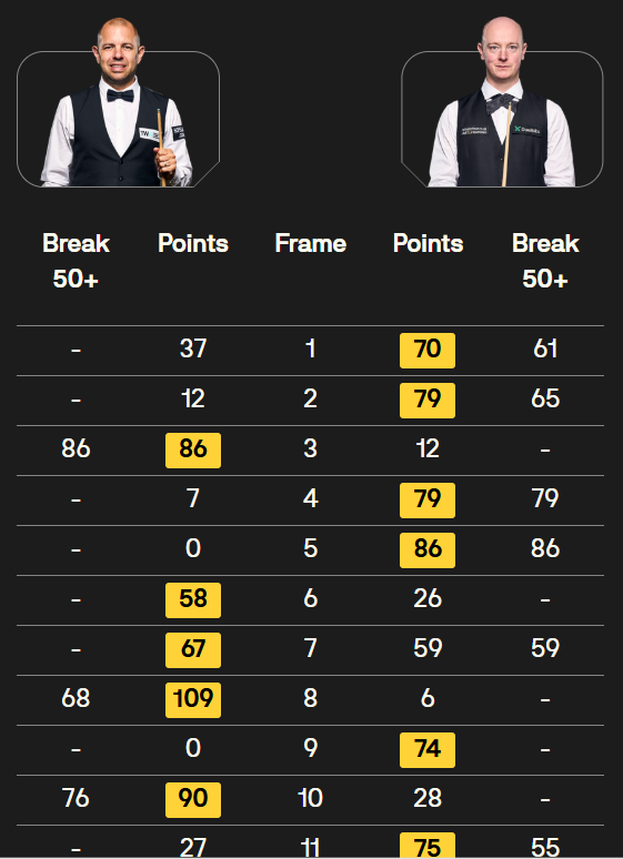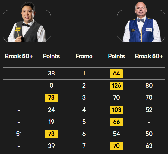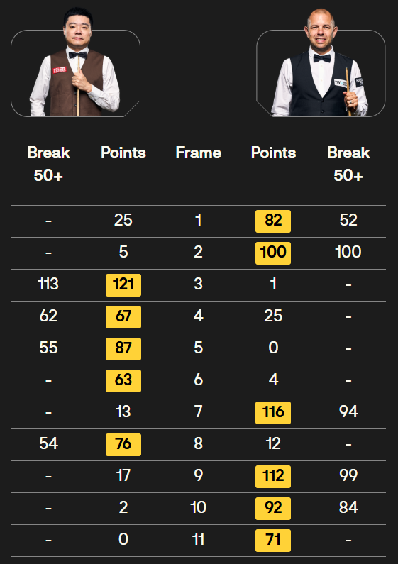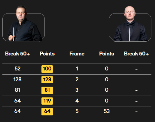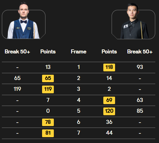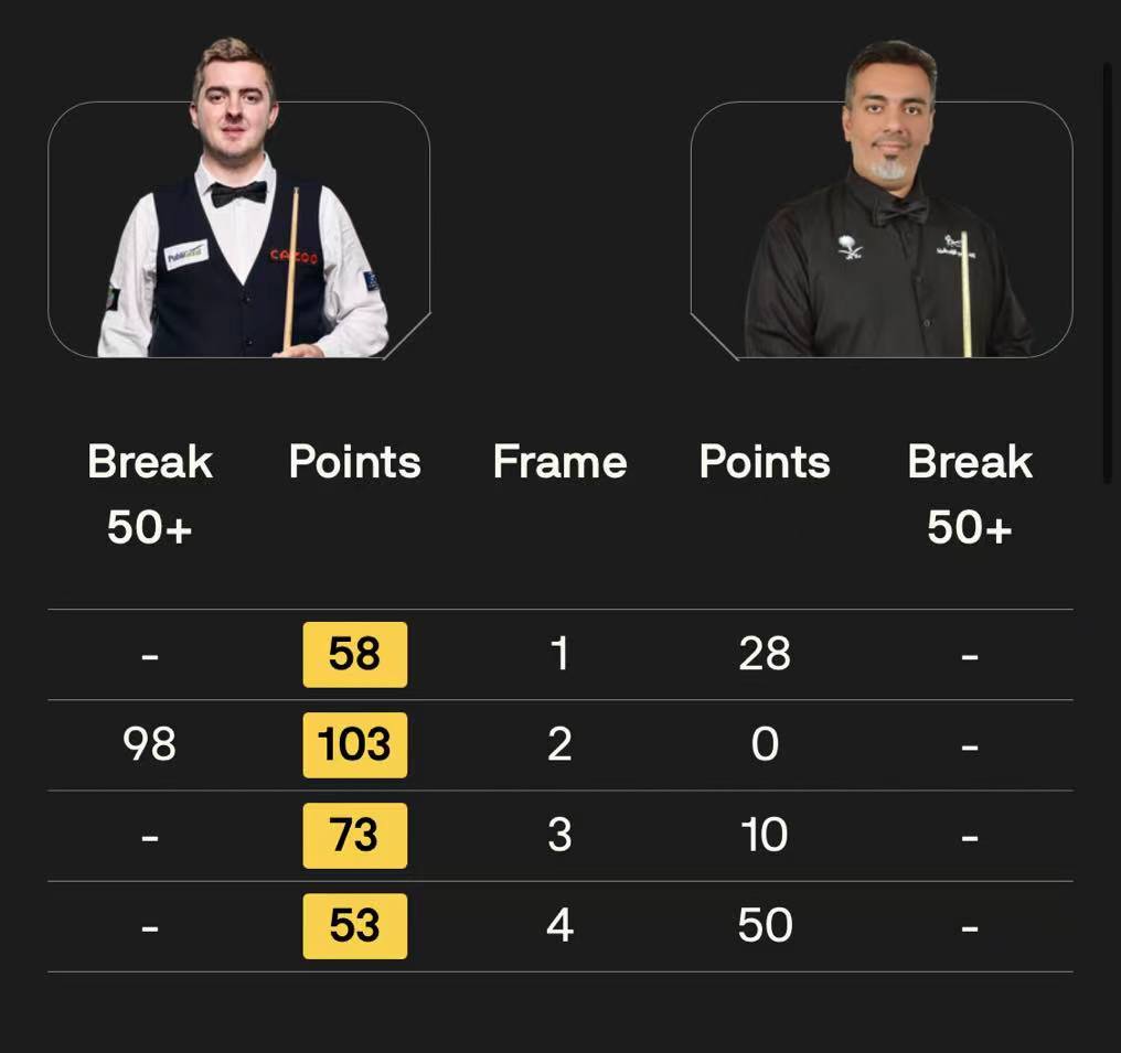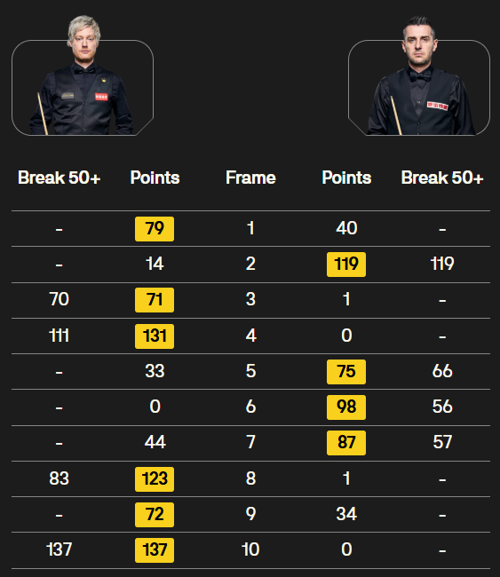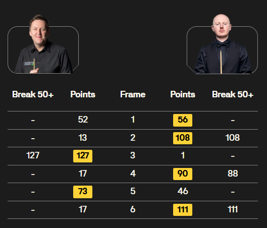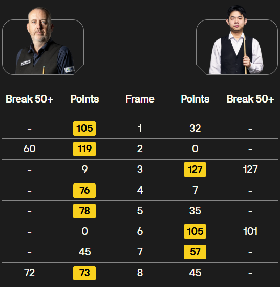 马克·塞尔比在第二局打出119分,这是他职业生涯的第900杆百分杆。他是第五位达成这一里程碑的球员。