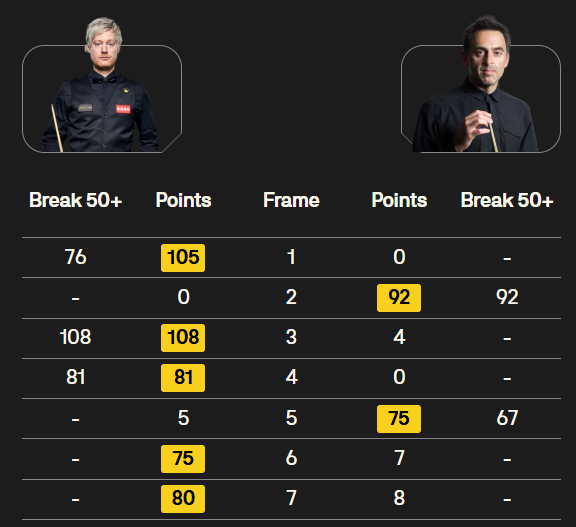 奥沙利文在第1局和第7局分别打出了147满分杆。距离他上一次打出满分杆已经过去了近7年。