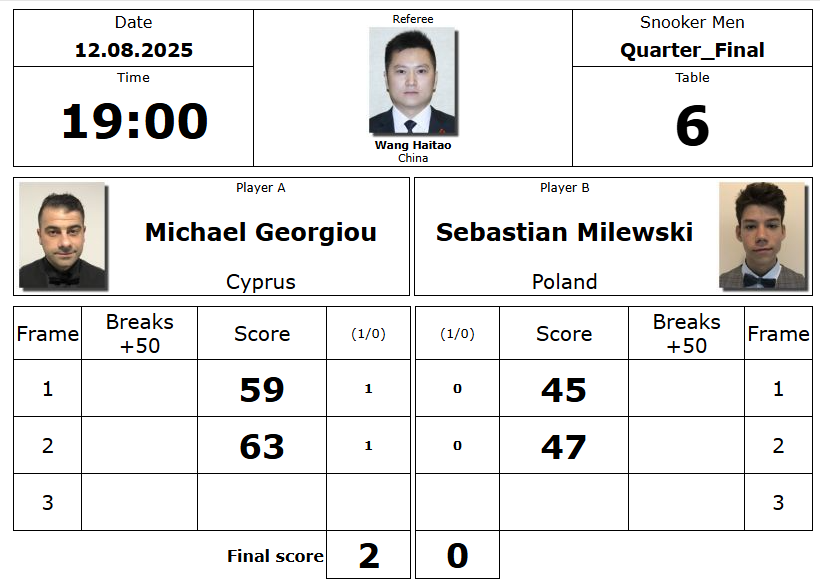 Michael Georgiou (a) 2-0 Sebastian Milewski (a) 详情