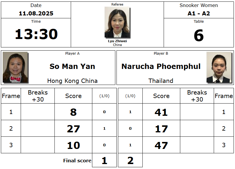 Narucha Phoemphul (af) 2-1 So Man Yan (af) 详情