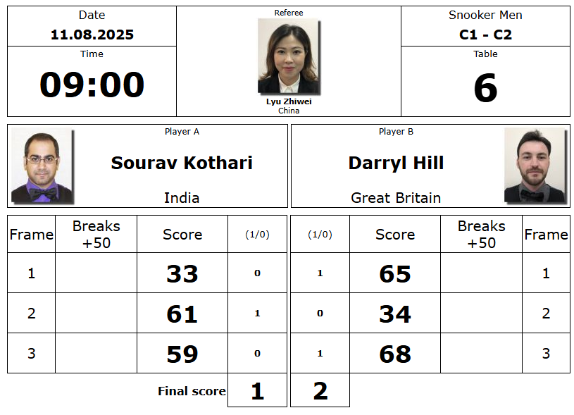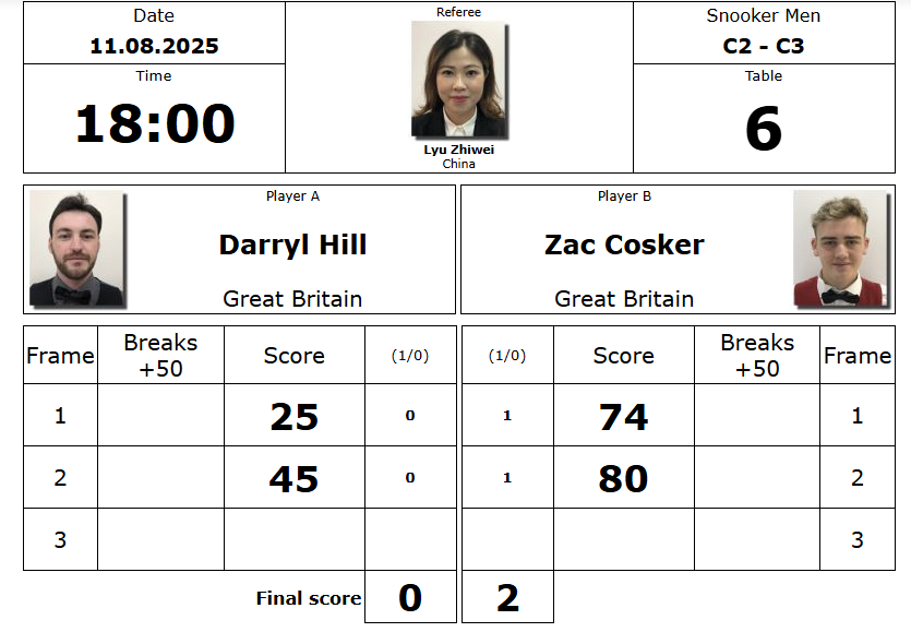 Zac Cosker (a) 2-0 Darryl Hill (a) 详情