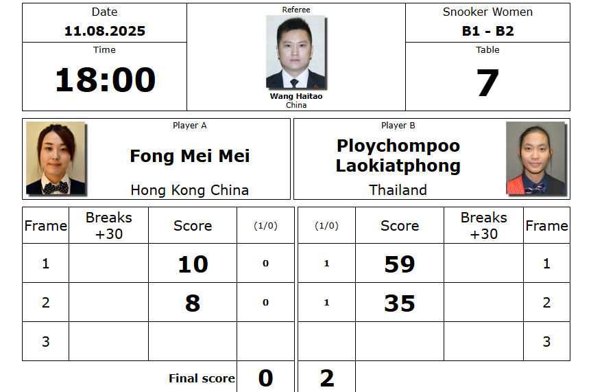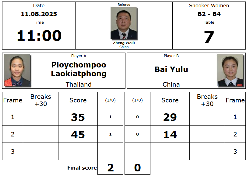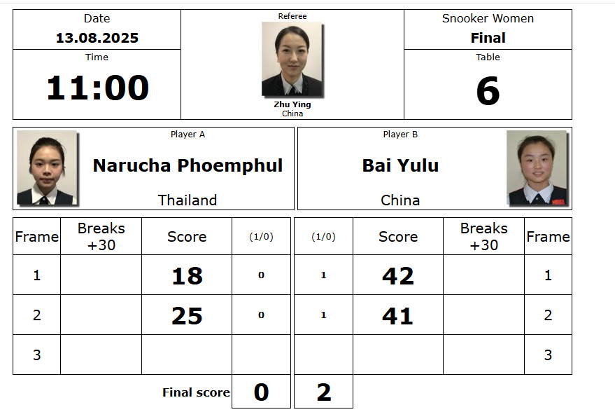 白雨露(f) 2-0 Narucha Phoemphul (af) 详情