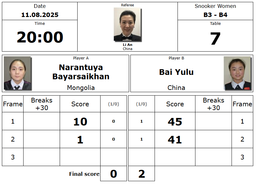 白雨露(f) 2-0 Narantuya Bayarsaikhan (af) 详情
