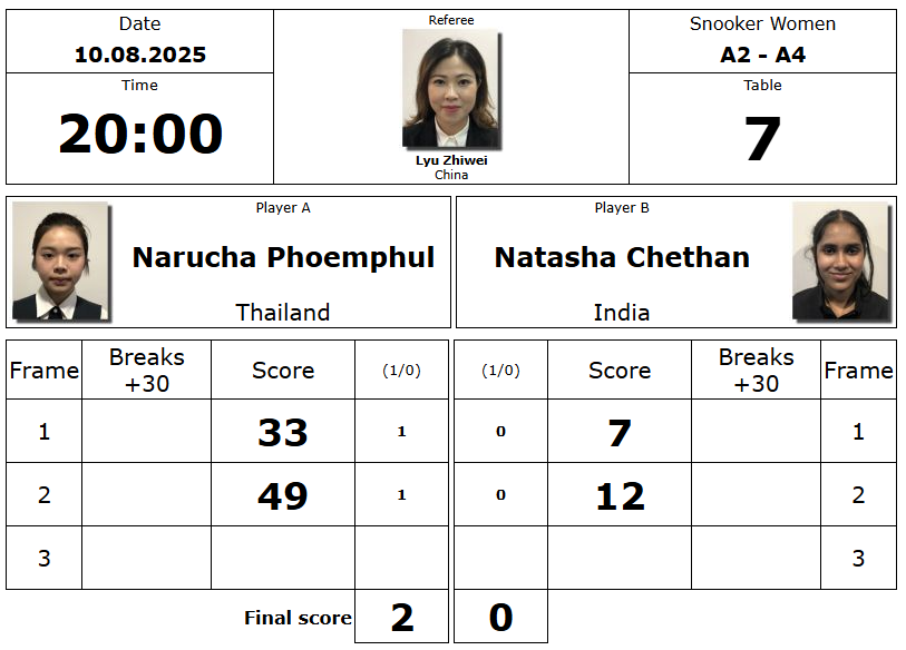 Narucha Phoemphul (af) 2-0 Natasha Chethan (af) 详情
