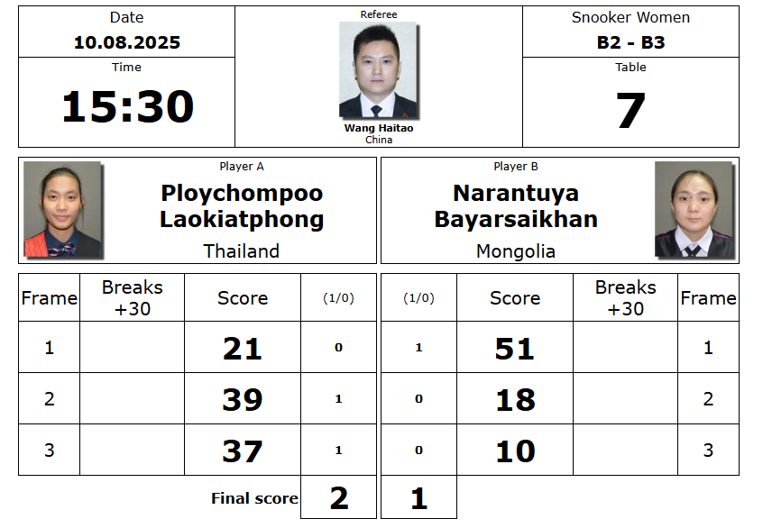 P Laokiatphong (af) 2-1 Narantuya Bayarsaikhan (af) 详情