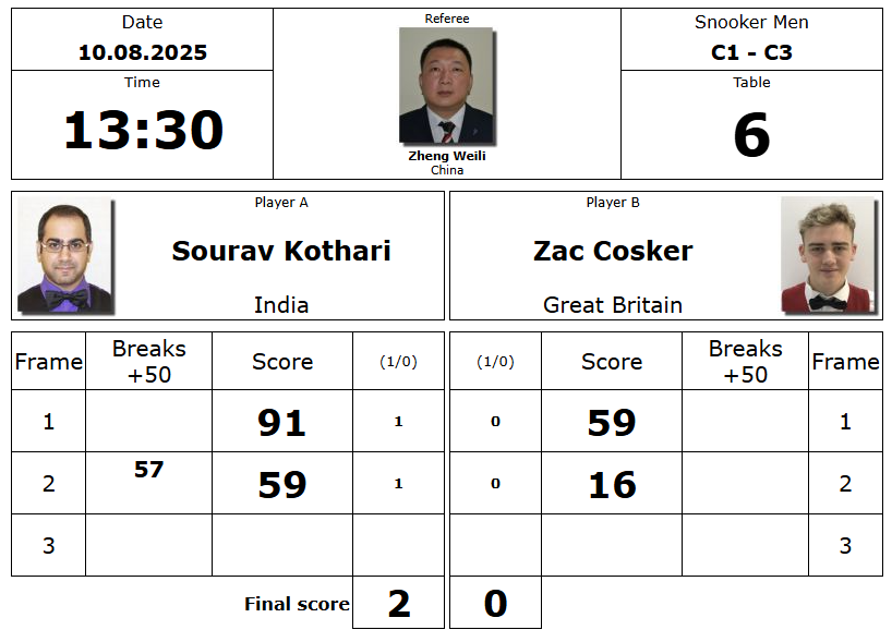 Sourav Kothari (a) 2-0 Zac Cosker (a) 详情
