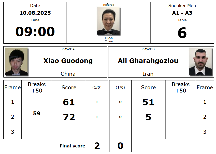 肖国栋 2-0 Ali Gharahgozlou (a) 详情